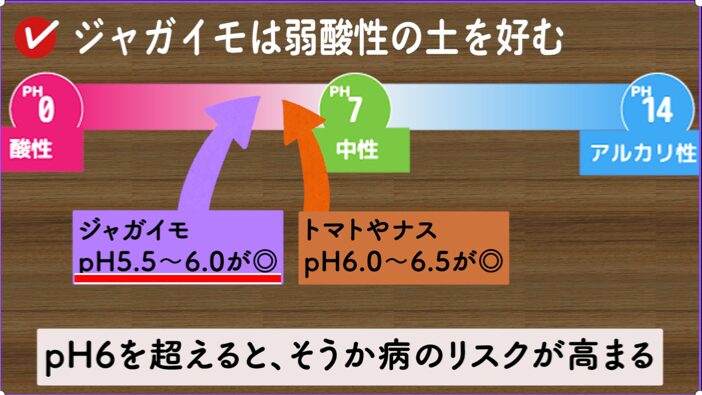 土壌のpHが高くなり数値が6を超えてくる、つまりアルカリ性に傾くとジャガイモは「そうか病」が出やすくなります。