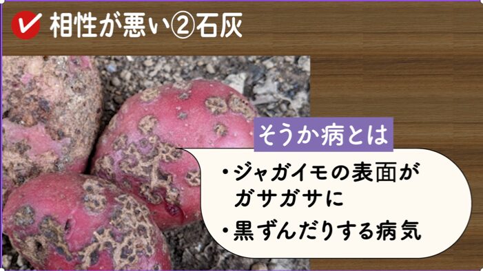 石灰と併用すると、土が一気にアルカリ寄りになり、そうか病や芋の肌荒れを引き起こす原因になります。