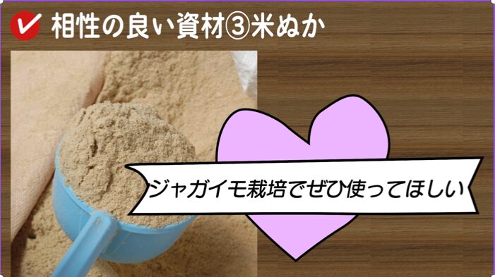 米ぬかはジャガイモ栽培ではぜひ使ってほしい資材です。