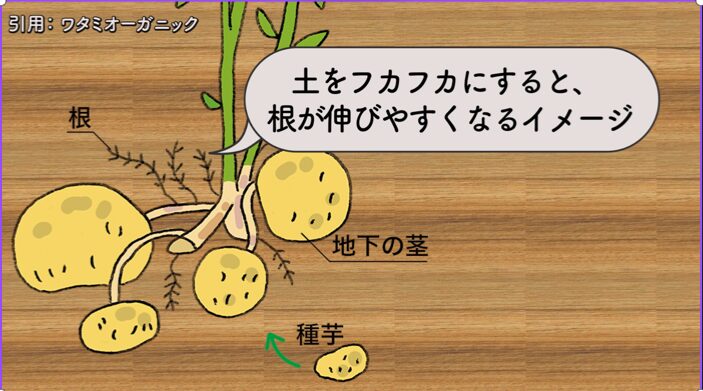 しかもジャガイモは地下で茎が膨らんで芋になる作物です。土の中で大きく育つためにはある程度のスペースが必要です。土がふかふかになることで大きく育つためのスペースが確保できるというわけですね。