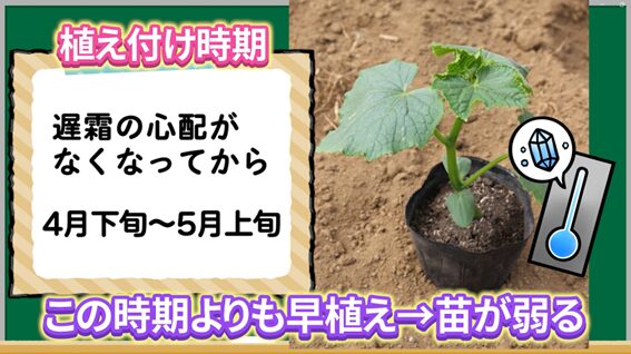 キュウリの苗を植えるタイミングは、遅霜の心配がなくなってから。地域にもよりますが、4月の下旬から5月の上旬ごろが目安です。