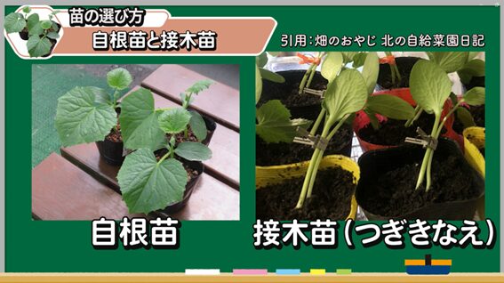 キュウリの苗は、自根苗(じこんなえ)と接木苗(つぎきなえ)の2種類に大きく分けられます。