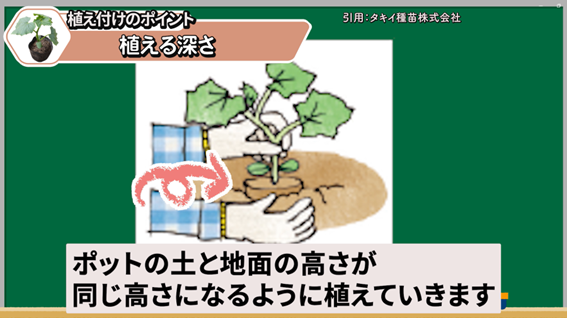 キュウリの苗は、ポットの土と地面が同じ高さになるように植え付けます。