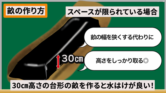 スペースが限られている場合は、高さをしっかり取る方法もおすすめです。30㎝ほどの高さがある台形の畝を作ると、水はけもよくなって育てやすくなりますよ。