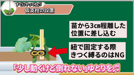 苗から3cmほど離れた場所に仮支柱をまっすぐ差し込み、8の字を意識しながら紐で苗を固定します。きつく縛るのではなく、「少し動くけど倒れない」くらいのゆとりを持たせてあげることがポイントです。