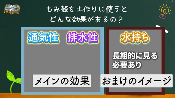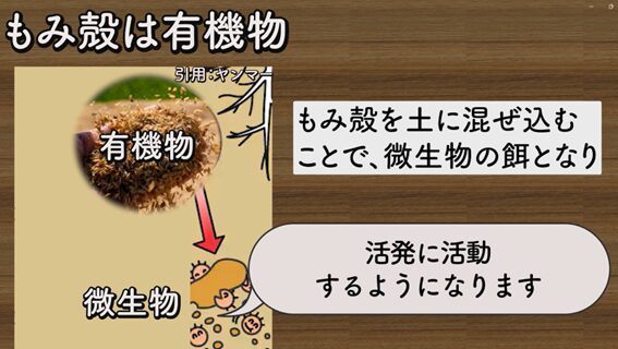 さらに、長期的に見ても大きなメリットが。もみ殻が長い時間をかけて土の中で分解されていく過程で、水持ちの改善が期待できるんです。