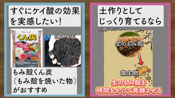 ですから、「すぐにケイ酸の効果を実感したい!」という場合は、もみ殻を焼いたものである「もみ殻くん炭」を使うことがおすすめです!