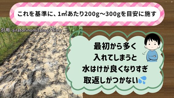 もみ殻を施す場合は、少量から試してみてください。もみ殻を施しても「改善が見られない」という場合に、少しずつ量を増やしていくやり方がおすすめです。