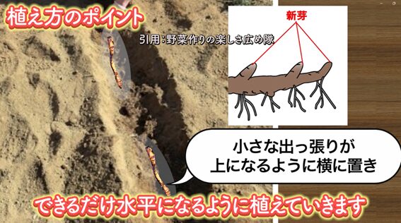 植え付ける際は、深さ10~15cmほどの植え穴を掘って、カットした根株を植えていきます。その際には「小さな出っ張り」が上になるように横に置いて、できるだけ水平になるように植えていきます。