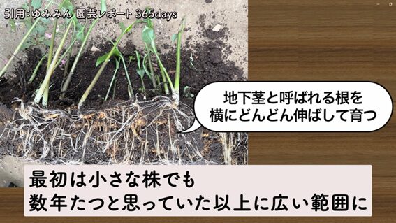 ミョウガはタネで育てるのではなく、地下茎と呼ばれる根で増えていきます。これがしっかり根付くと、 翌年以降も同じ場所から芽を出してくれます。