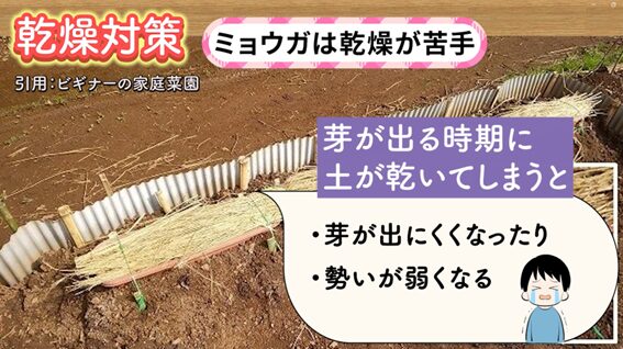 ミョウガの植え付けが終わったら乾燥対策をします。ミョウガは乾燥が苦手な野菜で、 特に芽が出る時期に土が乾いてしまうと、芽が出にくくなったり、芽が出ても勢いが弱かったり…。