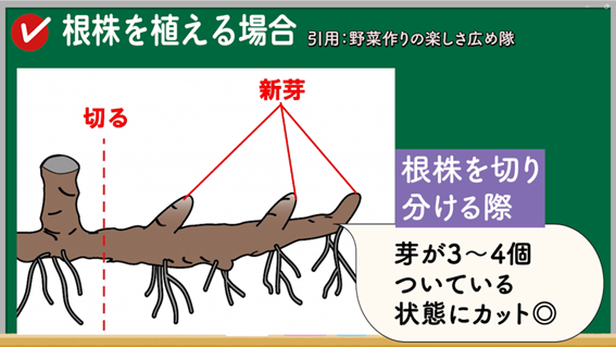 このでっぱりは、やがて茎や葉っぱになっていくミョウガの芽です。根株を切り分ける際は、芽が4つぐらいついている状態にカットして、この芽が上になるように植えてくださいね。