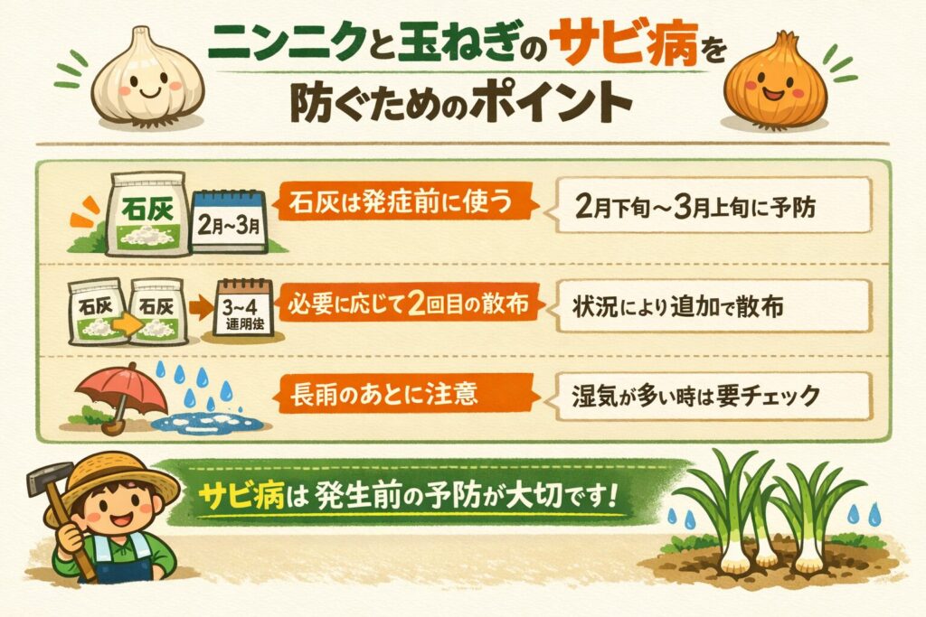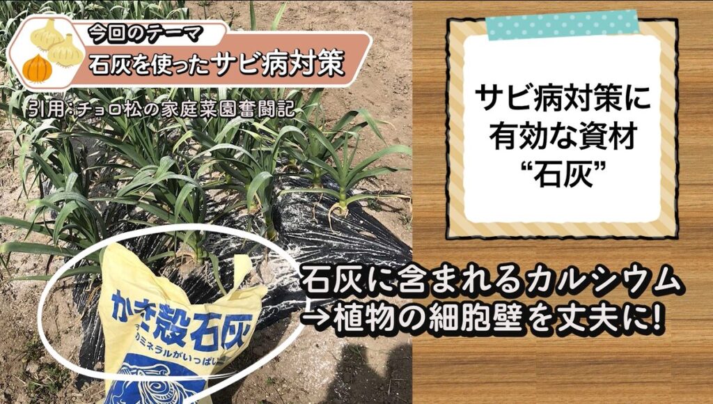 特にニンニクや玉ねぎのようなネギ科野菜では、石灰を上手に使うことでサビ病の発生を抑える効果が期待できます。