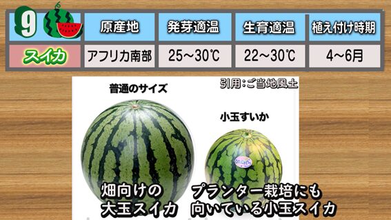 9番目は、「スイカ」です。スイカは家庭菜園では少し難易度が高い野菜ですが、採れたて スイカのみずみずしさは格別です。