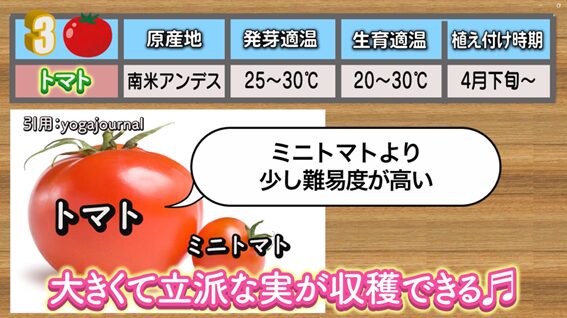 3番目は、「トマト」です。ミニトマトよりも難易度が高いですが、収穫のときの喜びは格別です!