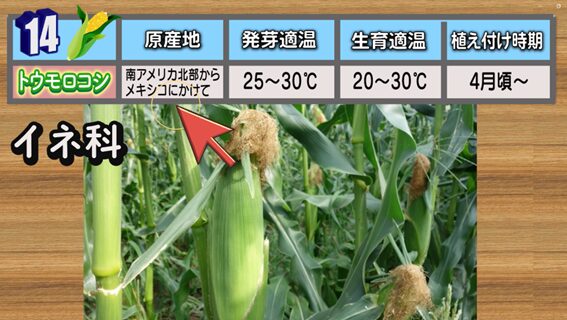 14番目は、「トウモロコシ」です。比較的丈夫な野菜ですが、しっかり実を付けさせるためには日当たりの良い場所で栽培することが必要です。
