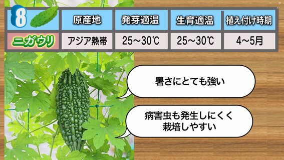 8番目は、沖縄料理でもおなじみの「ニガウリ」です。「ゴーヤー」や「ツルレイシ」とも呼ばれていますよね。