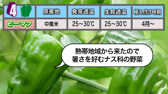 4番目は、暑さを好むナス科の野菜である「ピーマン」です。