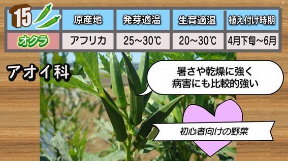 15番目は、「オクラ」です。暑さや乾燥に強く、病害にも比較的強い初心者向けの野菜なんです。