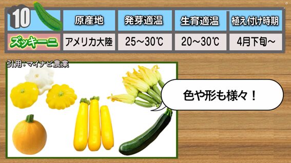 10番目は、カボチャの仲間の「ズッキーニ」です。