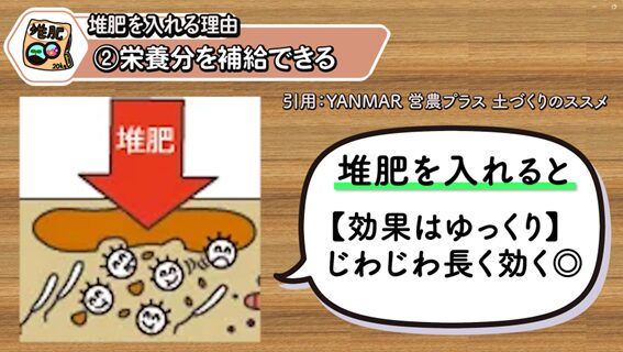 そのため、堆肥の効果はゆっくりなのですが、じわじわと長く植物に栄養分を補給してくれるということなんです。