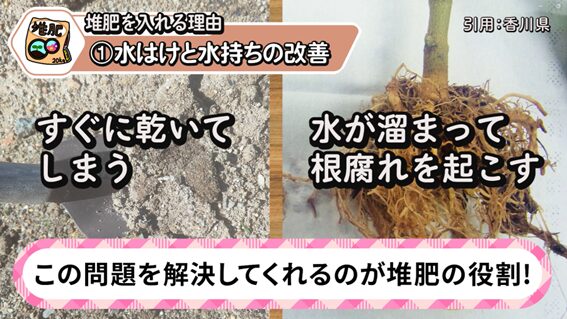堆肥を入れることで土の中に“すき間”ができるので、水はけと水持ちが良くなります。