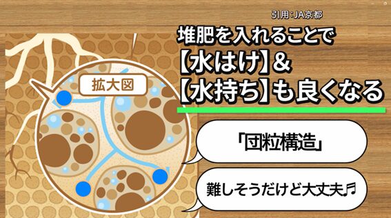 実は、堆肥はこの団粒構造を作ってくれる微生物たちのエサになるんです。エサが増えると微生物が活発に働くようになって、この団粒構造がどんどん作られていくんですよね。