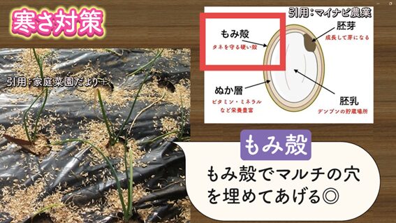 もみ殻をマルチの穴に2~3cmほどの厚さで敷くだけで、保温や保湿、雑草の抑制までしてくれます。