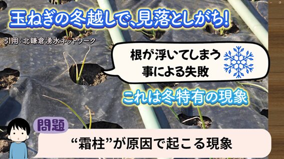 これは、「霜柱」が原因で起こる現象です。土と一緒に玉ねぎの根が地表に押し上げられてしまい、冷たい外気に直接さらされてしまい、どんどん根が弱っていきます。