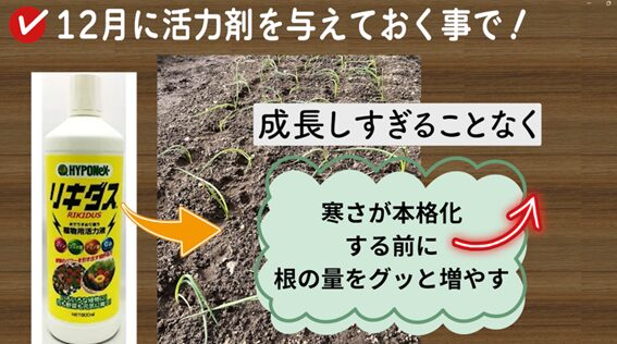 12月のタイミングで一度活力剤「リキダス」を与えておくと成長しすぎることなく、 根の量をグッと増やすことができます。
