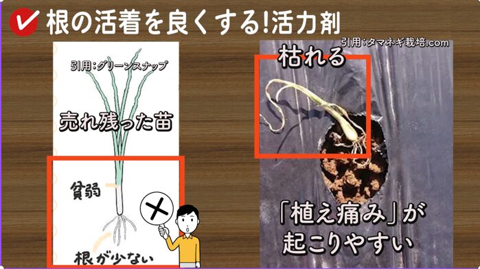 さらに市販の玉ねぎ苗は、輸送や束ねられている間に根が乾いた状態になりやすいため、植え付け直後は特に不安定な状態です。