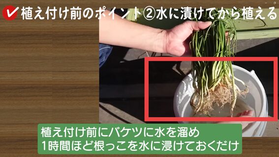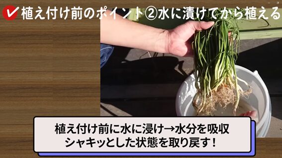 玉ねぎ苗を購入してきたら、必ず水につけてから植えるようにしましょう。苗が水分を吸収することで元気になり、植え付け直後の活着と根付きが格段に良くなります。