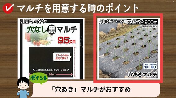 マルチは、「穴あき」マルチがおすすめ!少しお値段は高くなりますが、植え付けの際に自分で穴をあける手間がなく、その後の管理も楽になります。