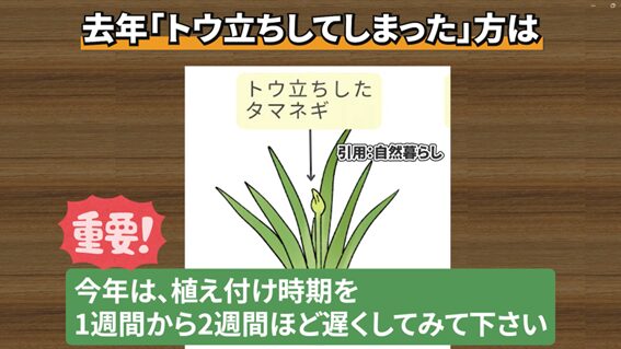 去年育てた玉ねぎがトウ立ちをしてしまった」と言う方!今年は、植え付け時期を1週間から2週間ほど遅くしてみてください。
