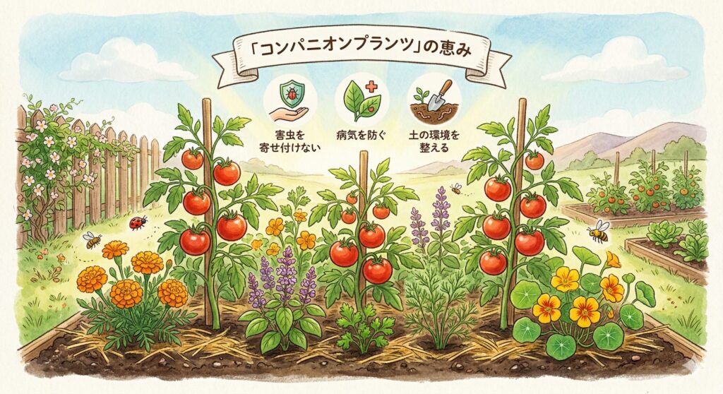 トマトの近くに植えることで、根まわりの環境を整え、病気に負けにくい状態をつくるサポートにつながります。