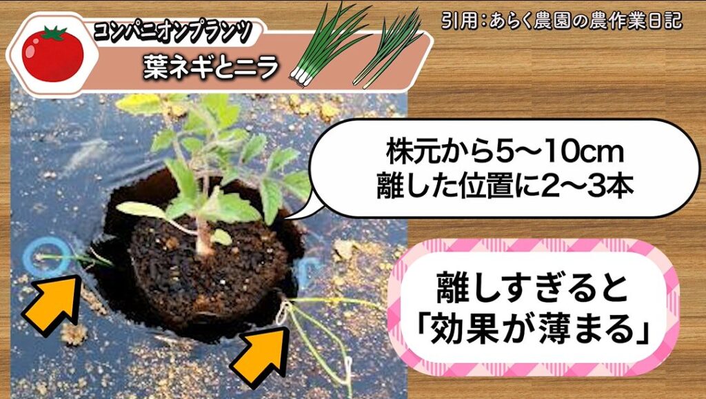 葉ネギやニラをトマトと一緒に植えるときは、植える位置がとても大切です。