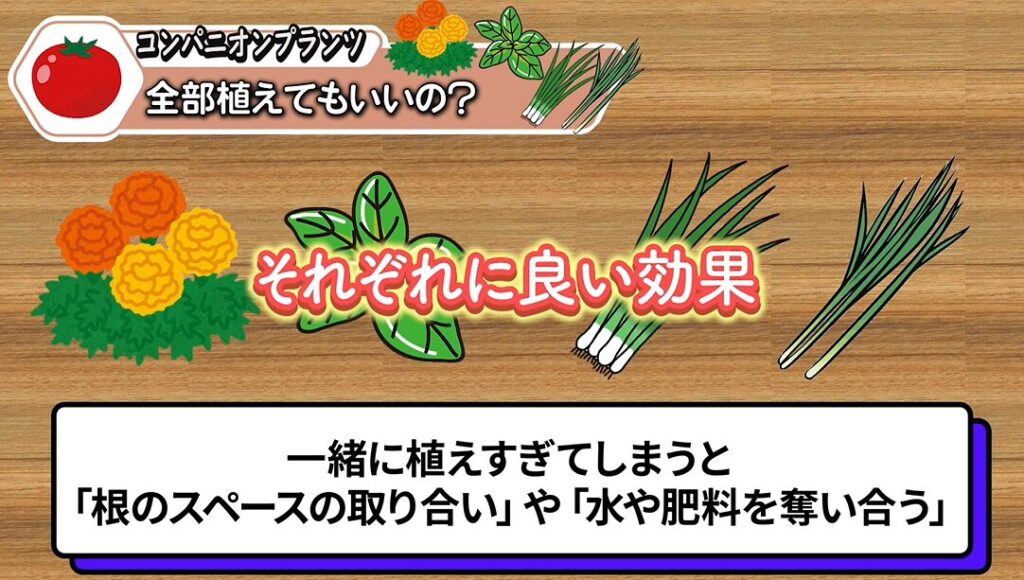 つまり、トマトを元気に育てたいなら、「どう育てるか」だけでなく、「何と一緒に育てるか」も大切ということです。